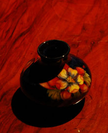 MOORCROFT社製(英)年代不明。濃紺に渋い花柄のモークロフト独特の色とデザインです。高さ7,2cm、横8,7cm。