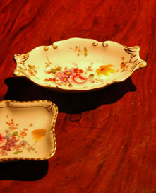 ROYAL CROWN DERBY社製(英)、年代不明(おそらく1940年頃)真ん中のピンクの花以外はすべて手描きです。(なぜ、そのような面倒なことをしたのかは分かりません。)高さ2,5cm、横13,8cm、縦8,8cm。
