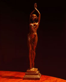 ダンシング・ガール。年代不明。ベース部分は大理石です。胸にターコイズと赤い石がはめ込まれています。高さ50cm。