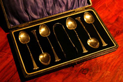 シルバー・スプーン&トングセット。ホール・マーク付き、1918年バーミンガム。柄の部分にツイスティングデザインを取り入れたおしゃれなティースプーン&トングセットです。箱もオリジナルですが、止め具が付いていません。(長さ10cm) ¥35.000