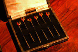 エナメルド・シルバー・カクテル・スティック6本セット。ホールマーク付き。1926年、バーミンガム。オリジナル箱付き。トップにエナメルで彩色されたニワトリ(コックテール)が付いたおしゃれなカクテルスティックです。 ¥48.000