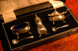 シルバーソルト、ペッパー&マスタード・セット。ホールマーク付き。1985年バーミンガム。オリジナル箱付き。小さめな3点セットです。ソルトとマスタード入れには中にブリストル・ブルーのガラス容器が入っています。年代は新しいですが、デザインはヴィクトリアンのものです。 ¥68.000